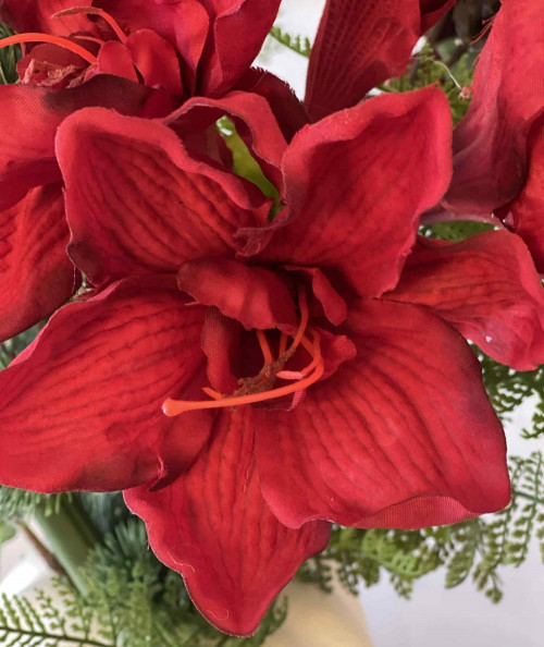 Amaryllis er perfekt alene i en vase, hvor den kan stå som et iøjnefaldende centerpiece, men den fungerer også smukt i kombination med grønne grene, hvide blomster eller gyldne detaljer. Dens intense røde nuancer giver en dramatisk kontrast, der passer både til moderne og traditionelle dekorationer.