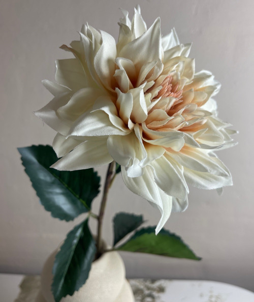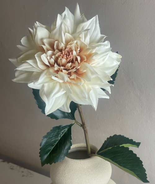 Lad elegance og romantik flytte ind i dit hjem med denne smukke Dahlia i creme, 71 cm. Blomstens fyldige kronblade og sarte farvespil fra creme til blød aprikos skaber et eksklusivt og naturtro udtryk, der emmer af luksus og varme.