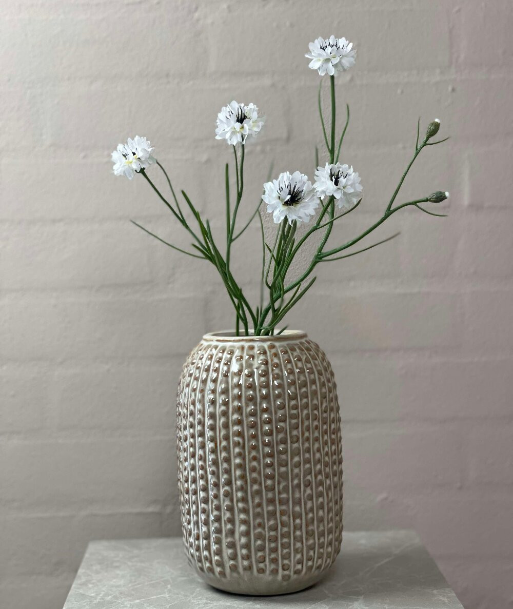Den klassiske kornblomst har fået et poetisk twist i denne elegante, hvide version. Med sine fine, lette blomster og luftige, grønne stilk giver den hvide kornblomst et romantisk og fredfyldt udtryk, der passer perfekt i alt fra lyse sommerbuketter til stilrene evighedsarrangementer.