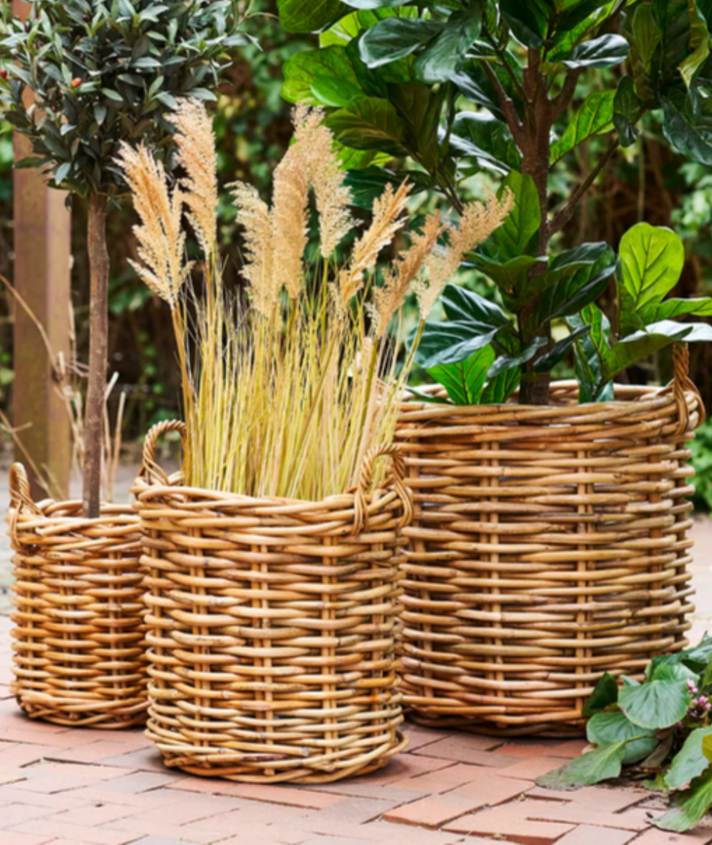 De tre kurve varierer i størrelse, så du får fleksibel opbevaring til ethvert behov. Det robuste rattanmateriale sikrer holdbarhed, mens de stilfulde håndtag gør det nemt at flytte kurvene rundt i hjemmet – eller haven.