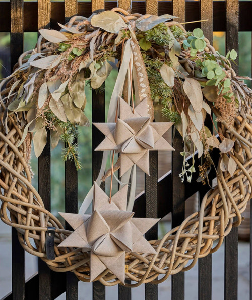 Den håndlavede fletning betyder, at hver krans har sit eget udtryk. Rattanens naturlige farvespil – fra lyse til mere grålige toner – giver kransen en levende struktur og en autentisk karakter, som gør den ideel til både moderne og klassiske boligstile.