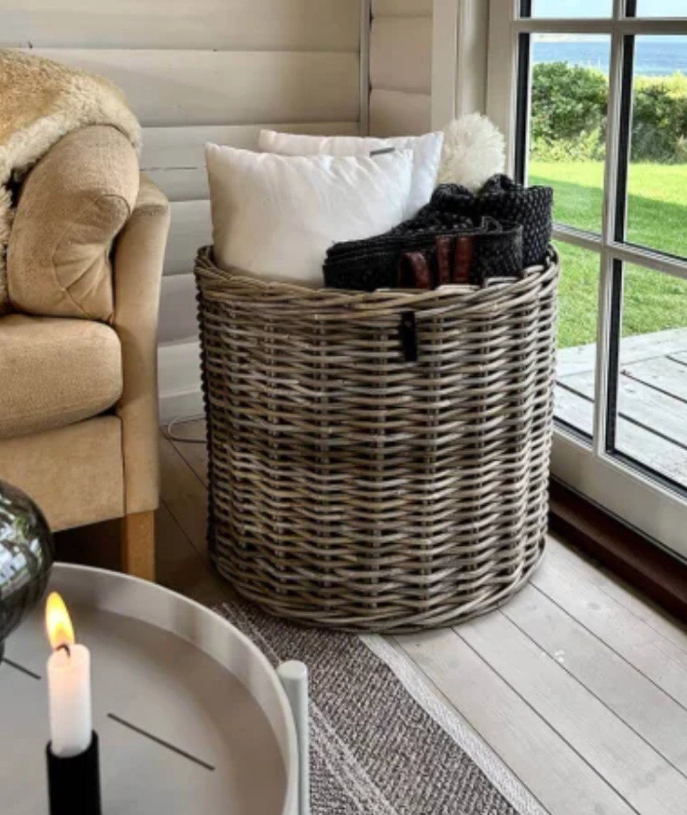 Med sin størrelse er kurven oplagt som plantekurv til mellemstore planter, små træer eller grønne arrangementer, hvor den medfølgende kraftige plastindsats gør det nemt at plante direkte i den. Den fungerer også perfekt som opbevaring til tæpper, puder eller legetøj og kan skabe ro og orden i både stue, entré og udestue. På terrassen tilfører den varme og et naturligt udtryk, som bløder omgivelserne op.