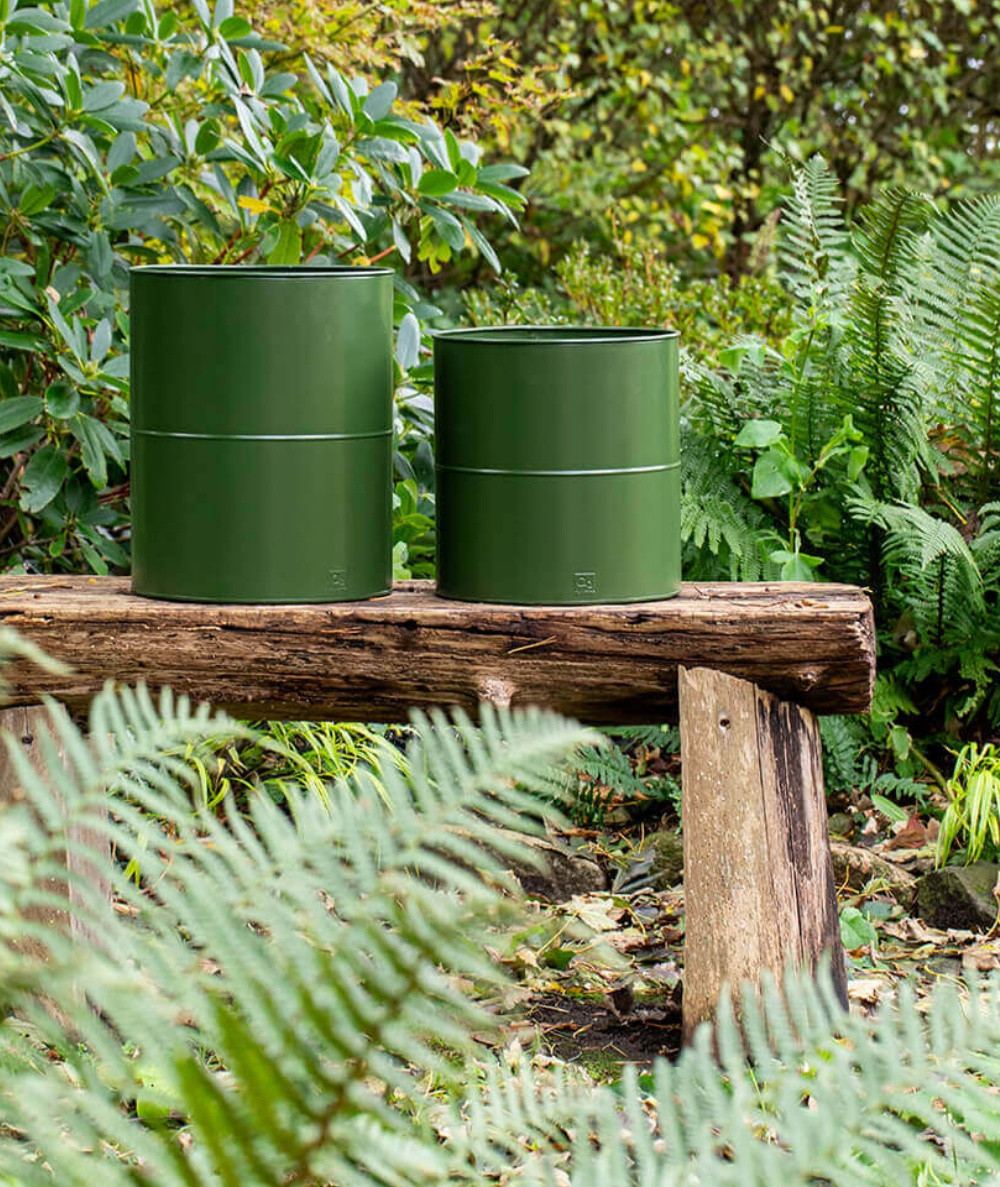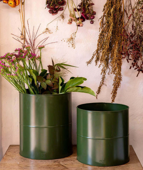 Blomsterspandene har et enkelt og stilrent design, som passer perfekt til den nordiske havestil. Den matte olivengrønne overflade fremhæver planternes former og farver og skaber en smuk helhed sammen med både grønne blade, blomster og græsser.
