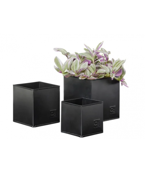 Potterne er fremstillet i galvaniseret plade med sort pulverlakering, hvilket giver et robust og holdbart materiale, der egner sig godt til både indendørs og udendørs brug. Indersiden er behandlet med silikone for ekstra beskyttelse og tæthed.