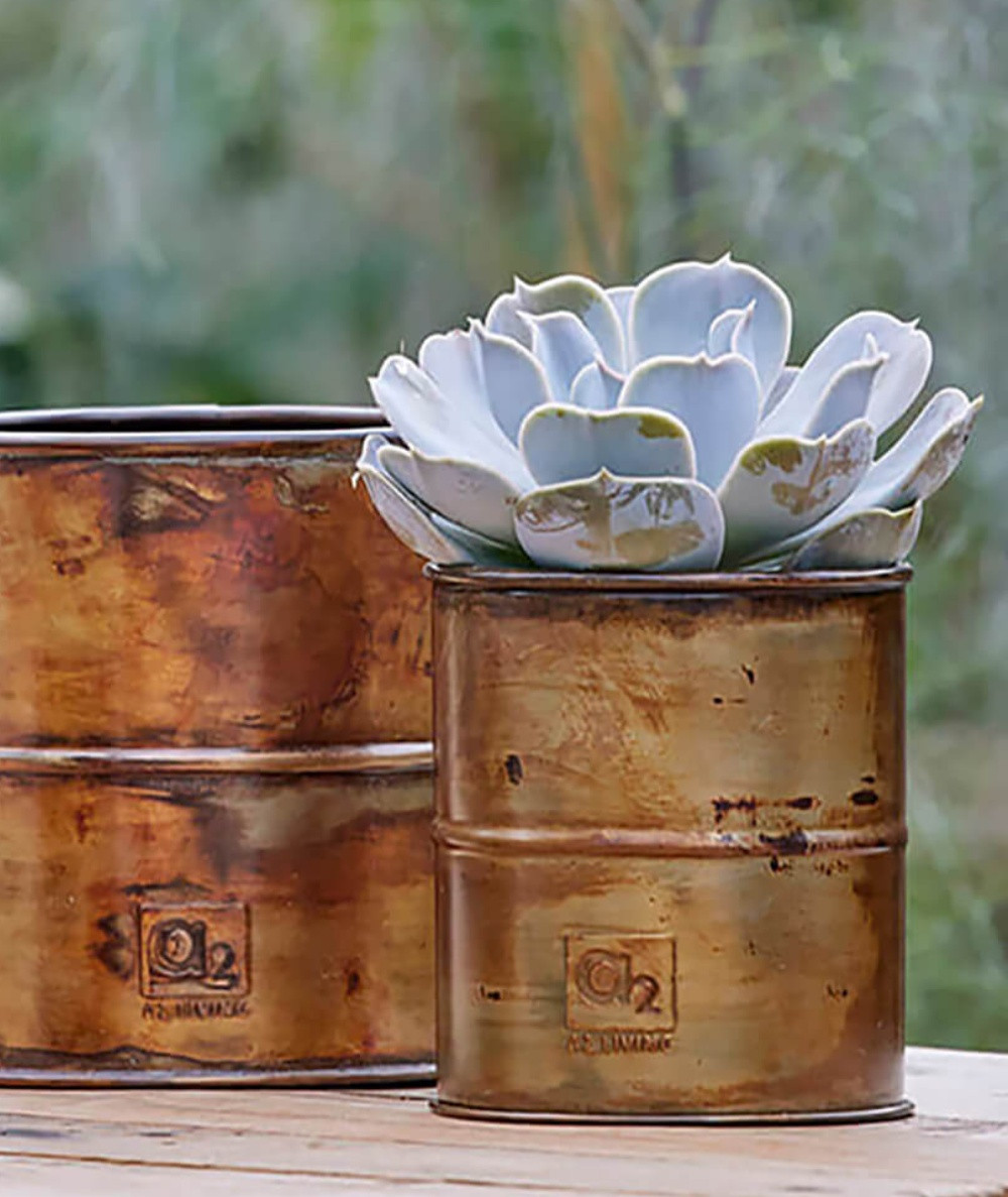 Den varme metalfarve tilfører et rustikt og dekorativt element til uderummet. Når sollyset rammer overfladen, får spandene et levende spil i farven, som giver opstillingerne ekstra dybde og karakter.