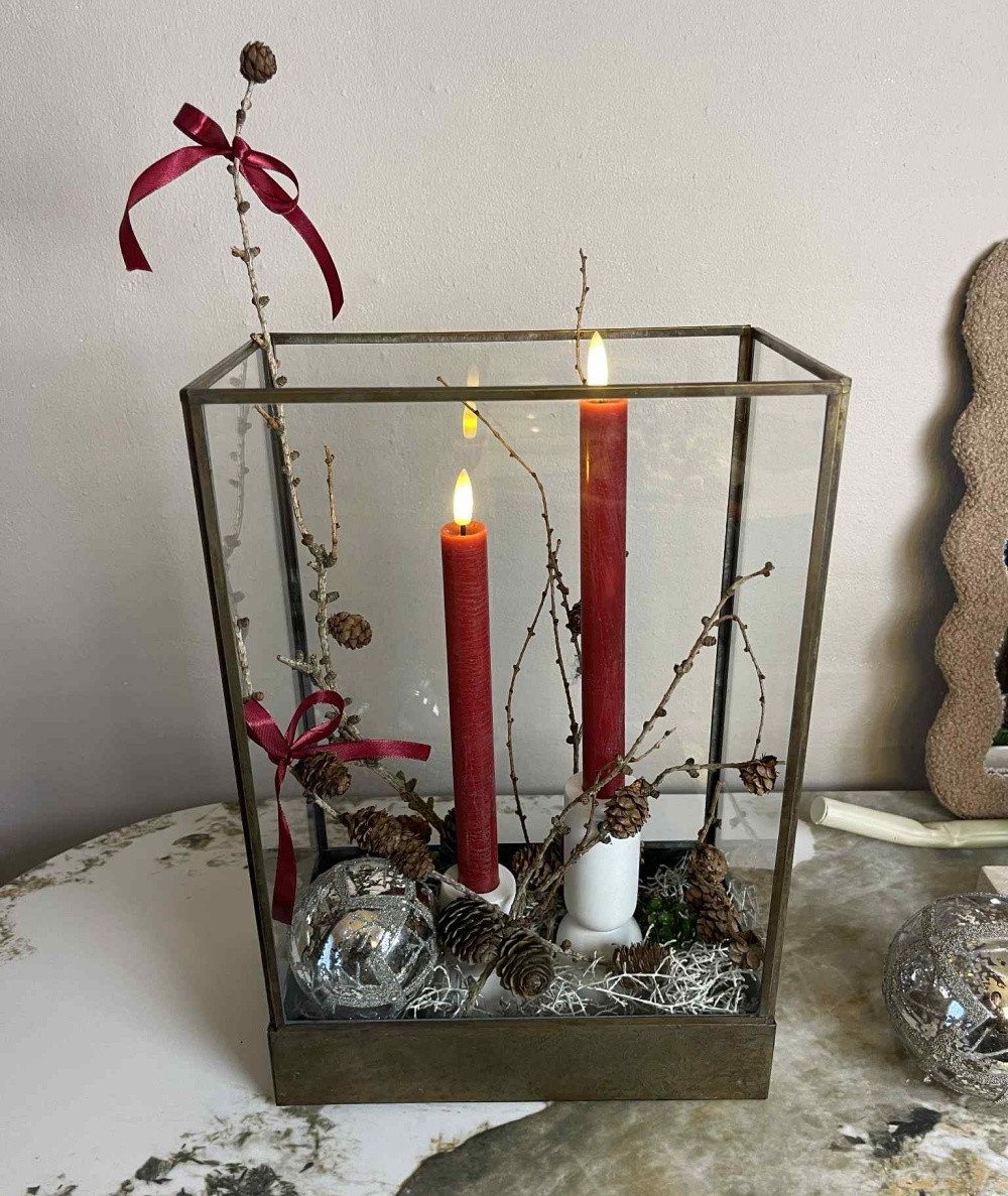 Her er lysene placeret i en elegant glaslanterne sammen med naturgrene, små kogler, sølvkugler og røde silkebånd, som tilsammen skaber en enkel, men utrolig stemningsfuld dekoration. De røde LED-lys står smukt mod de naturlige elementer og tilfører både varme og dybde til indretningen.