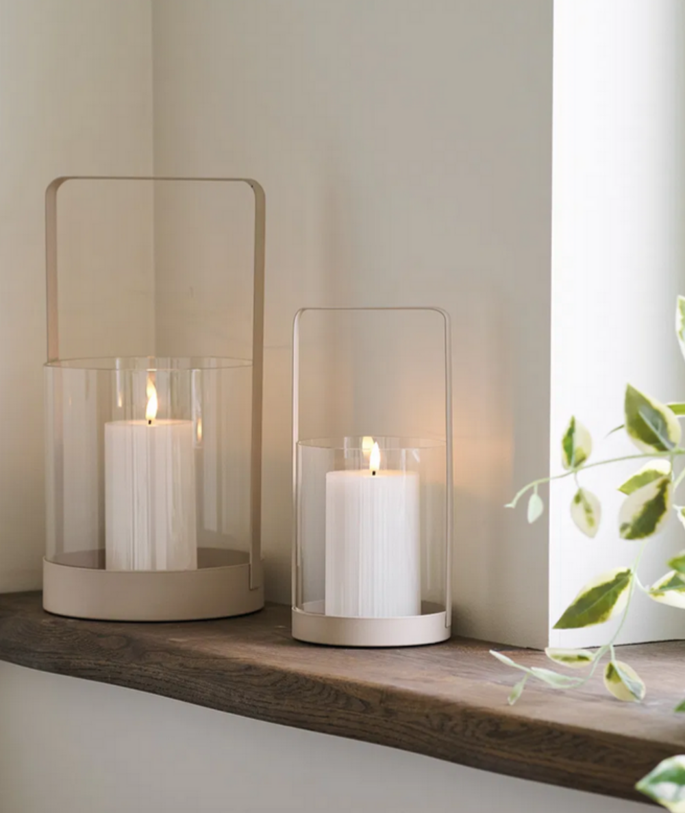 De to elegante hurricane lysestager i beige er skabt til at bringe ro, varme og stemning ind i dit hjem. Kombinationen af klart glas og den fine metalbund giver et let og harmonisk udtryk, som passer smukt ind i både moderne og klassiske indretninger. Når lyset tændes, indrammer glasset flammen på en rolig og beskyttende måde, så lyset får lov at spille blødt og skabe en hyggelig atmosfære.