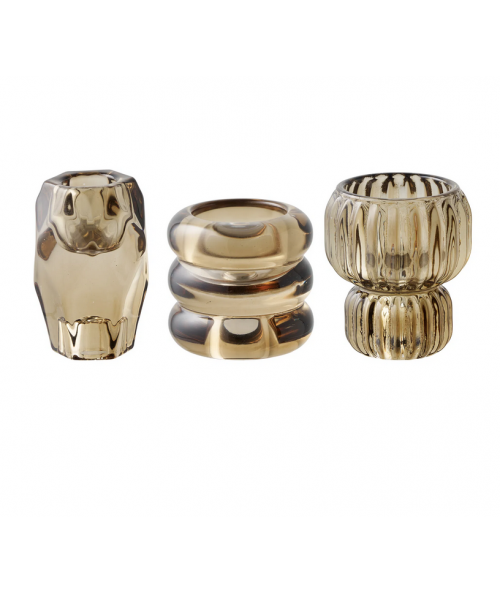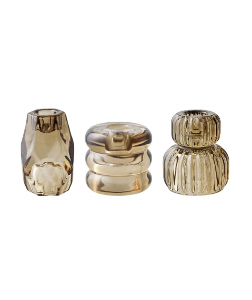 Dette sæt med tre lysestager i smoked brunt glas er skabt til at bringe varme, dybde og elegance ind i indretningen. Hver stage har sit eget unikke formsprog, hvilket giver sættet et levende og dynamisk udtryk, hvor de forskellige silhuetter spiller smukt sammen. Det røgede glas har en varm, gylden tone, som reflekterer lyset blødt og skaber en hyggelig atmosfære – perfekt til rolige aftener og stemningsfulde øjeblikke.