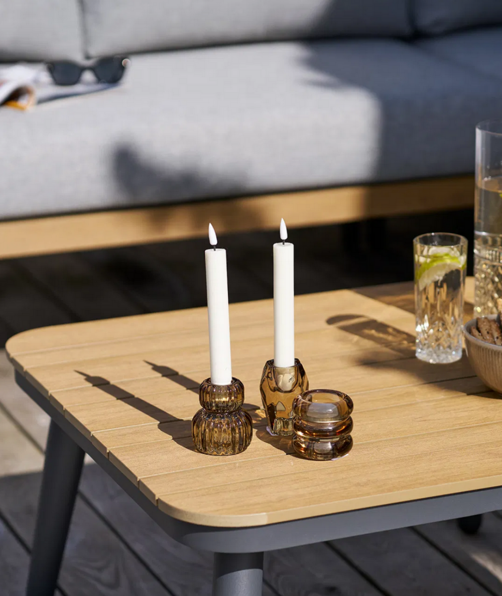 Tænker du ud af boksen, kan lysestagerne bruges som små dekorative beholdere til tørrede blomster, kogler eller andre sæsonbetonede detaljer, eller kombineres med LED-lys for et mere moderne og vedligeholdelsesfrit udtryk. De er også oplagte i et overdækket uderum, hvor det røgede glas giver et ekstra varmt skær til sommeraftenerne.