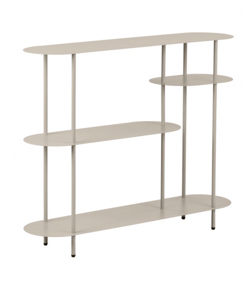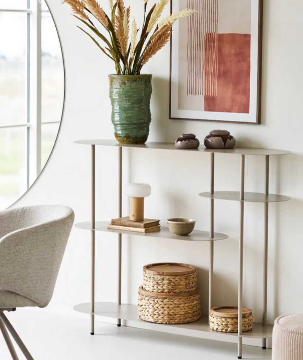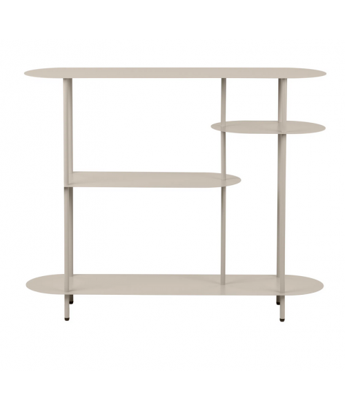 Nelli reolen er et elegant møbel til hjemmet, hvor funktionalitet og æstetik går hånd i hånd. Det lette, sandfarvede metal giver reolen et roligt og moderne udtryk, som passer smukt ind i både nordiske, minimalistiske og varme indretninger. De bløde, afrundede former på hylderne skaber et balanceret look, der føles både luftigt og gennemført – uden at virke tungt i rummet.