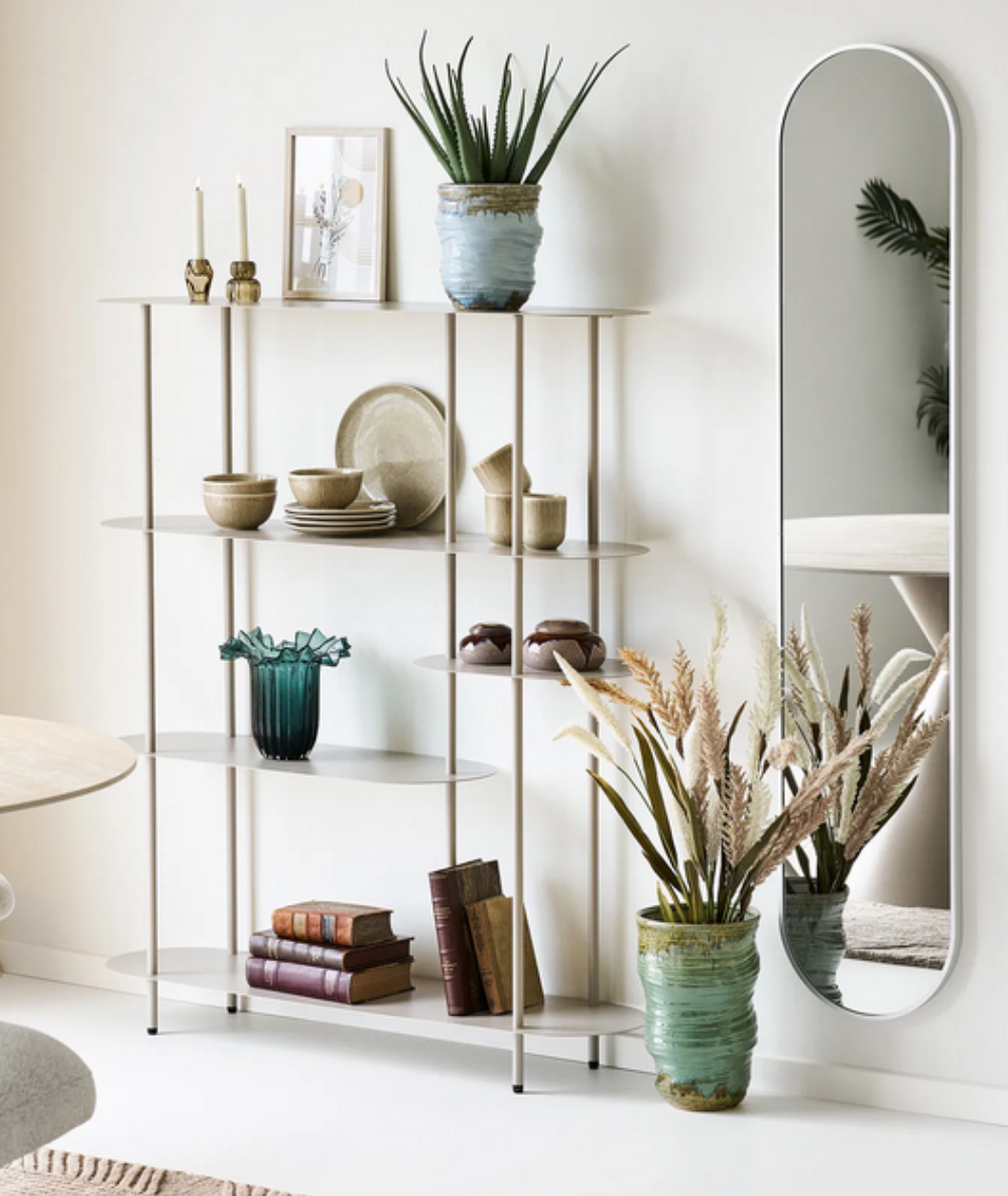 Med sine fem hylder i varierende niveauer giver Nelli reolen masser af plads til både dekoration og opbevaring. Brug den til bøger, vaser, planter og kunst – eller lad den stå mere luftigt med få, udvalgte elementer for et elegant udtryk. Reolen fungerer smukt i stuen, spisestuen eller som et stilfuldt blikfang i entréen.
