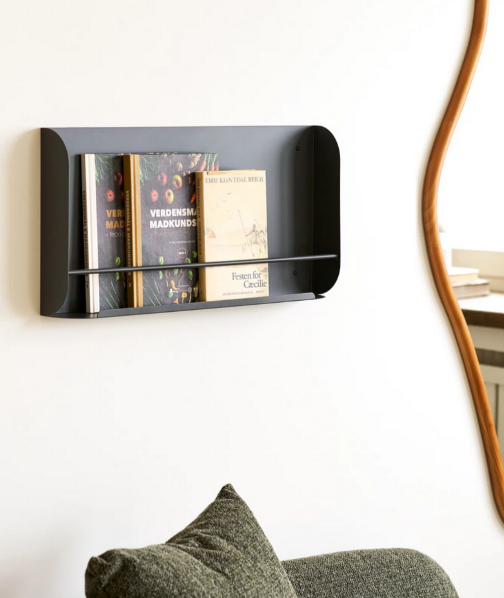 Væghylden gør sig også rigtig godt i kombination med andre materialer. Sæt den op over en sofa med tekstiler i varme nuancer for at skabe kontrast til metallet, eller brug den i et hjørne sammen med grønne planter for at bløde udtrykket op. I mindre rum kan hylden fungere som en let opbevaringsløsning, der ikke fylder visuelt, men stadig tilfører karakter til rummet.
