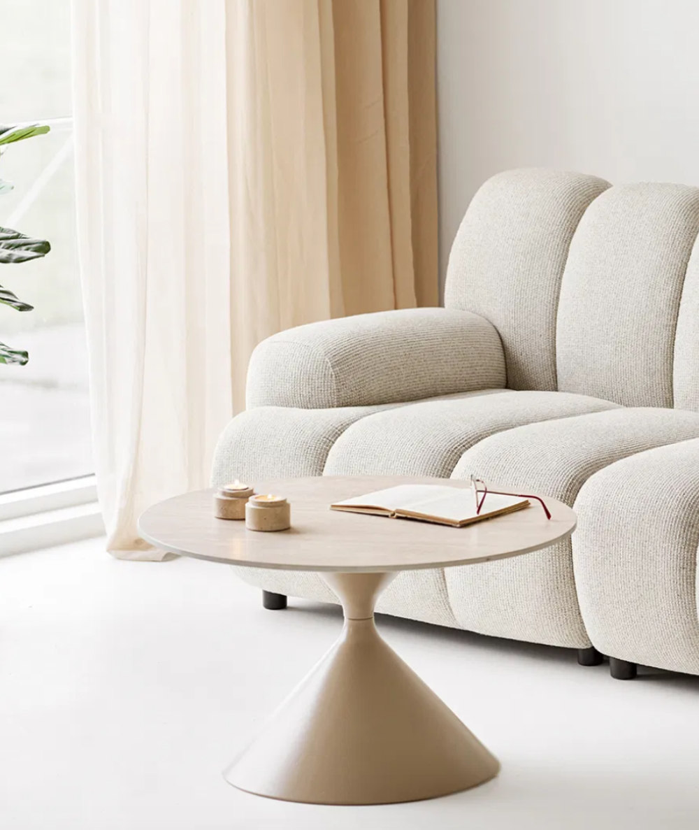 Den smukke sandfarvede tekstiloverflade tilfører varme og lys til rummet, mens de afrundede linjer skaber en afslappet og harmonisk stemning. Med sin generøse sædedybde og behagelige siddehøjde er Taza ideel til lange aftener med familien, hyggelige samtaler eller ren afslapning.