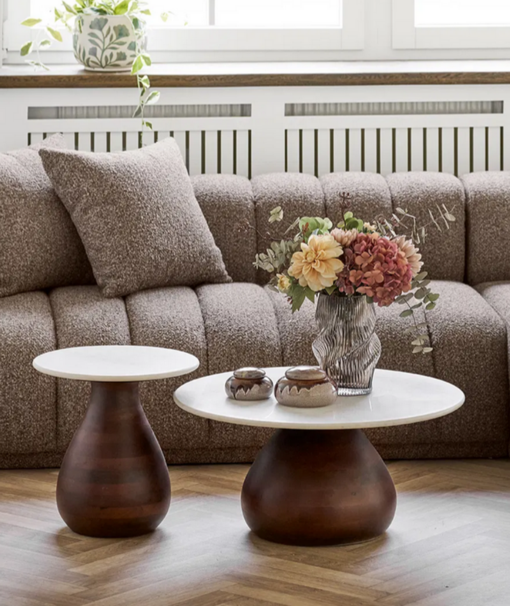 Heide sofabord er et elegant og karakterfuldt møbel, hvor kontrasterne arbejder smukt sammen. Den runde bordplade i hvid marmor tilfører et eksklusivt og roligt udtryk, mens den mørkebrune fod i mangotræ giver varme, dybde og tyngde til designet. Resultatet er et sofabord, der føles både moderne og tidløst på samme tid – og som naturligt bliver samlingspunktet i stuen.