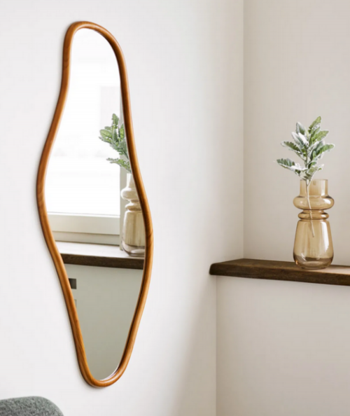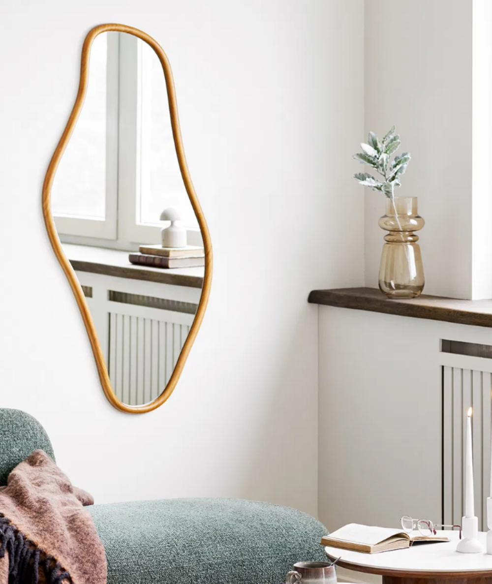 Brandsby spejl er et dekorativt statement, der bringer naturens bløde former direkte ind i dit hjem. Den organiske silhuet bryder med de klassiske, firkantede linjer og skaber et roligt, levende udtryk på væggen – som et lille kunstværk i sig selv.