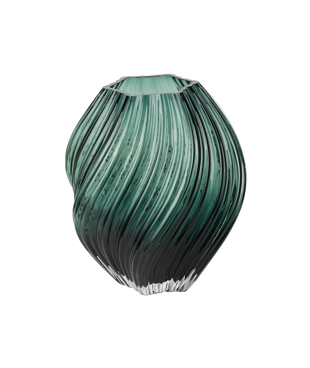 Denne vase i mundblæst mørkegrønt glas er et smukt eksempel på, hvordan håndværk og design kan smelte sammen til et dekorativt kunstobjekt. De snoede, vertikale linjer giver vasen en følelse af bevægelse, næsten som om glasset er formet i et blidt flow. Den dybe grønne farve skifter karakter afhængigt af lyset og tilfører indretningen både ro, tyngde og et eksklusivt udtryk.